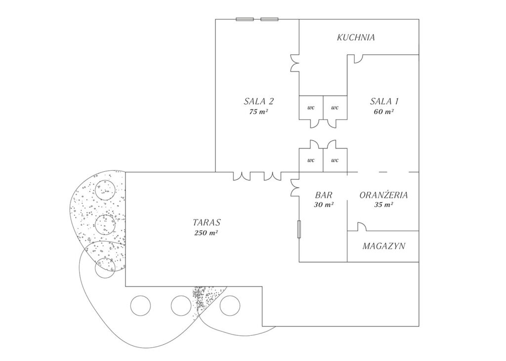 Zapraszamy do zabytkowych wnętrz, zaprojektowanych w klimacie starych Włoch. Dwie przestronne sale, zjawiskowa oranżeria z przeszklonym dachem i klimatyczny cocktail bar pozwala ugościć od 20 do 200 osób. Całość jest otoczona 150 metrowym zatopionym w zieleni tarasem oraz 100 metrowym ukrytym ogrodem.